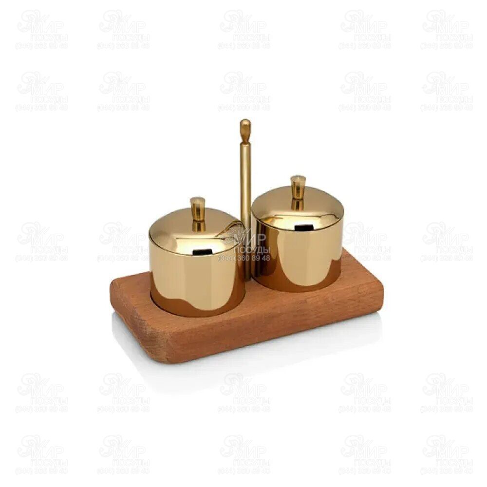 Набір золотистого кольору для спецій на дерев'яній підставці Varan це функціональний та естетичний елемент сервіровки, який дозволяє зручно зберігати та подавати основні приправи. Комплект не тільки полегшує процес приготування, але й гармонійно доповнює інтер'єр кухні, ресторану або кафе, додаючи сервіруванню завершеності.
