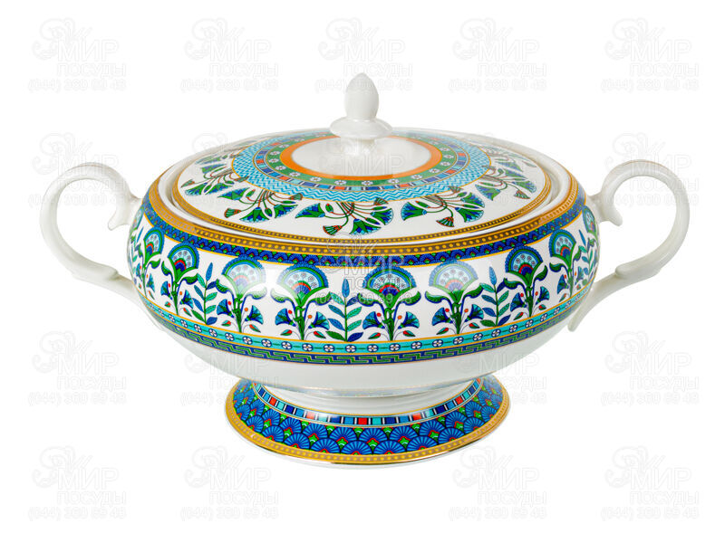 Вишуканий порцеляновий супник з ручками та кришкою від Lefard China прикрашений яскравим орнаментом у зелених, синіх та золотих відтінках. Ідеально підходить для подачі перших страв на святковий або щоденний стіл.