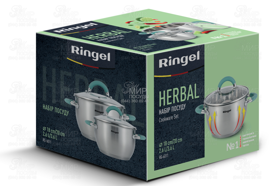 Набір посуду Herbal від Ringel виконаний із високоякісної нержавіючої сталі, безпека якої підтверджена європейськими сертифікатами із товщиною стінок 0,5 мм. Дана лінійка відрізняється зовнішнім і внутрішнім дзеркальним поліруванням. Внутрішні позначки літража допоможуть з легкістю готувати кулінарні шедеври, точно дотримуючись рецепту. Набір включає три оптимальні розміри каструль, які можуть стати в нагоді для щоденного використання. Потрійне капсульне дно забезпечує рівномірний розподіл тепла. Ергономічні ручки виконані з нержавіючої сталі із силіконовими накладками, що перешкоджають нагріванню. Мають надійне кріплення клепів, що забезпечить комфорт і безпеку під час приготування. До переваг, також можна віднести функціональну кришку, яка оснащена отвором для випуску пари та металевим обідком.