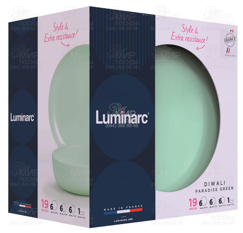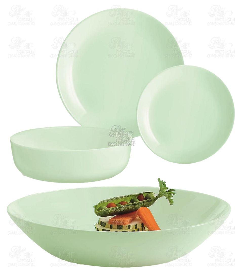 Столовий сервіз Diwali від Luminarc виготовлений із агартоване скло. Комплект світло-зеленого кольору стане справжньою окрасою обіднього столу.