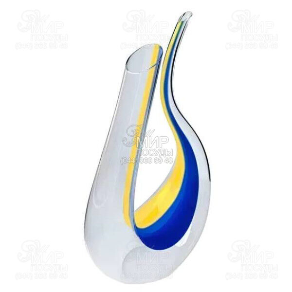Декантер від австрійського виробника Riedel виготовлений вручну із кришталю. Ексклюзивний декантер вражає не лише своєю скульптурною формою, а й глибоким символізмом. Поєднання насиченого синього та теплого жовтого кольорів асоціюється з національними барвами України, уособлюючи гармонію, силу, свободу та світло. Цей декантер являється не просто винним аксесуаром, а стильним акцентом із символічним змістом. Плавні лінії та динамічний вигин створюють ефект руху, нагадуючи про єдність неба й пшеничного поля — образ, близький кожному українцю. Водночас продумана форма забезпечує ефективну аерацію вина, розкриваючи його аромат і смакові ноти повною мірою.