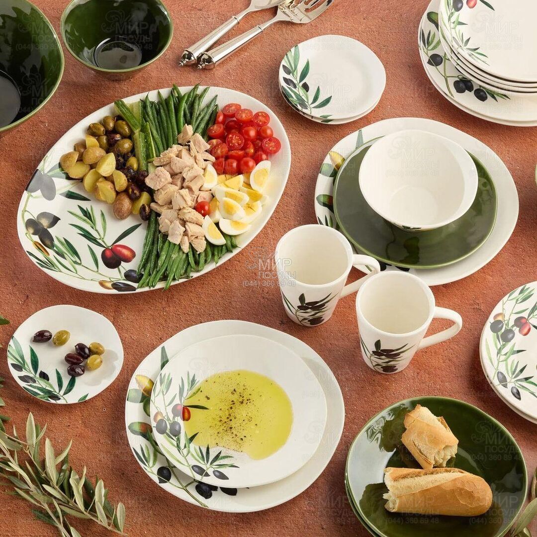 Столовий сервіз Гілка Оливи від американського бренду Certified International виготовлений із надміцної кераміки та покритий зносостійкою глазур'ю. Вироби ідеально поєднують у собі красу ручної роботи та практичний дизайн. Кожна ємність прикрашена мотивом оливкової гілки з соковитим зеленим листям і золотистими акцентами, які нагадують про безтурботність середземноморських гаїв.