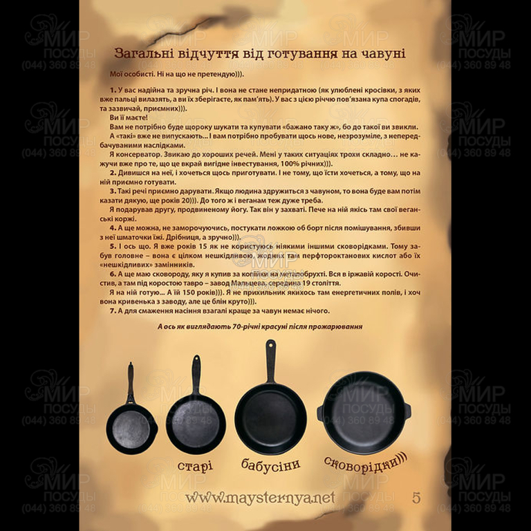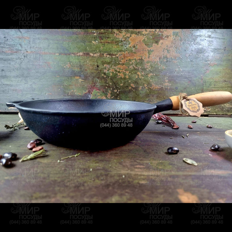 Пательня від українського бренду Maysternya виготовлена з чавуну. Покриття на чавунному посуді утворюється в процесі прожарювання, а в процесі приготування воно постійно оновлюється. Але це не антипригарне покриття, а найтонша полімерна плівка із запеченого масла, яка захищає пательню від корозії, а також має гідрофобні властивості (відштовхує воду). І тому, щоб не прилипало, готувати потрібно з олією. Чавун має гарну теплопровідність, що дозволяє рівномірно прогрівати всю поверхню пательні і рівномірно смажити.
