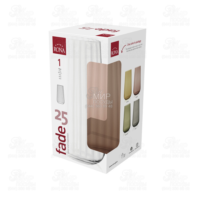Колекція Fade від словацького бренду Rona — це преміальний інтер'єрний декор, що поєднує сучасний дизайн та бездоганну якість європейського скла. Вертикальні грані формуються безпосередньо під час видування скла у форму, це створює виразний візуальний об'єм та красиву гру світла без додаткової обробки поверхні. Ідеально тримає форму квіткових композицій та ефектно виглядає як самостійний акцент в інтер'єрі.