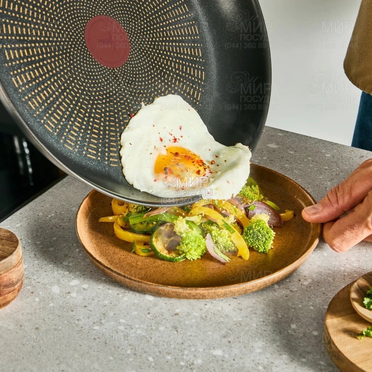 Пательня Emotion+ від Tefal поєднує корпус із нержавіючої сталі та антипригарне покриття Extra Life X5, що забезпечує стійкість до зношування під час щоденного використання. Індикатор нагріву Thermo-Signal стає повністю червоним при досягненні оптимальної температури для початку приготування. Індукційне дно забезпечує рівномірний розподіл тепла під час приготування на різних типах плит. Ручка має гвинтове кріплення до корпусу. Поєднання нержавіючої сталі та бакеліту знижує передачу тепла до зони хвату.