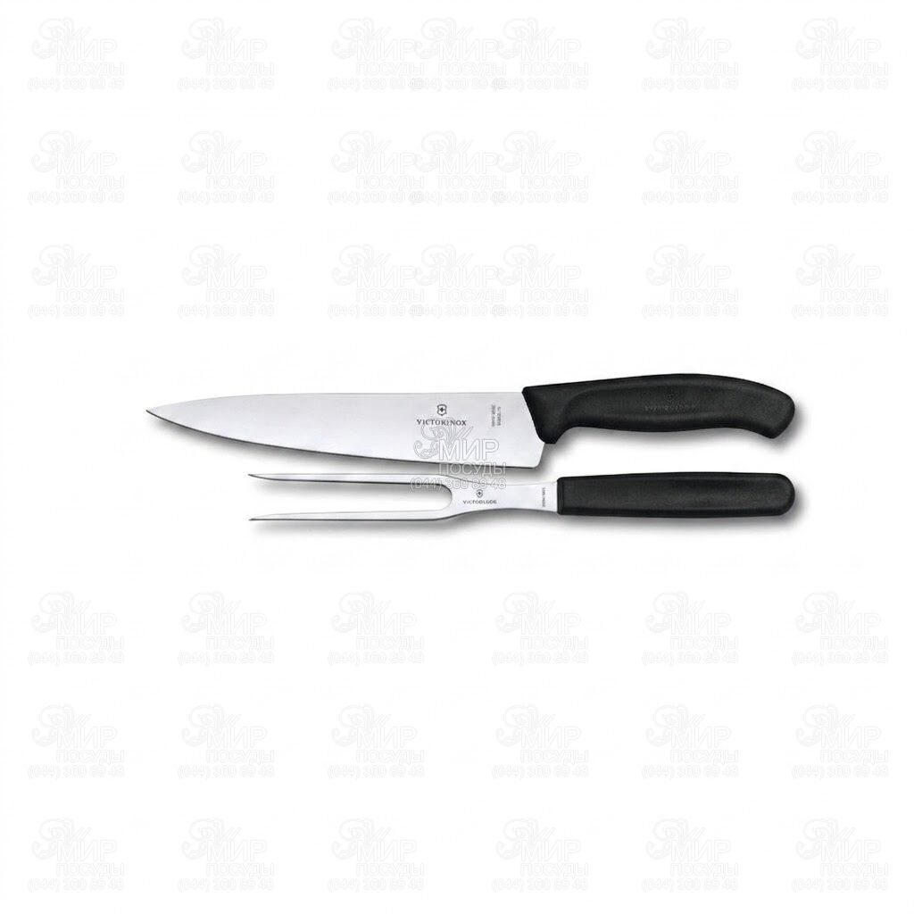 Набір для нарізання Swiss Classic від Victorinox — являє собою функціональний комплект інструментів, незамінних на будь-якій кухні. Ніж має широке масивне лезо з гладким заточуванням робочої поверхні і гострим кінчиком. Така конструкція клинка забезпечує ефективне і якісне оброблення м'ясних і пташиних туш. Ніж дає змогу акуратно відокремити філе від кістки, а потім нарізати його таким чином, як того вимагає конкретна страва. Виделка представлена двома довгими, гостро заточеними зубцями, які зроблять процес приготування їжі значно простішим, швидшим і безпечнішим. Застосовуючи таку виделку, кухар легко зможе перевернути або зняти стейк, що готується на розпеченій пательні, або сосиски, що мліють на грилі.
