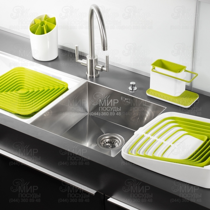 Для кожного пристрою контейнер має відповідний відсік. Єршик та пляшки зберігаються всередині спеціального сегменту. Для ганчірки створена спеціальна поперечина, на якій вона знаходиться у підвішеному стані, тому дуже швидко висихає. Губку можна скласти у спеціальний відділ з отворами, крізь які рідина з мокрої губки стікає у спеціальний резервуар. Цей гарний та багатофункціональний кейс допоможе зберегти ідеальний порядок біля раковини. Замовити цю стильну та містку сушку для посуду можна з доставкою по Києву чи всій Україні за допомогою нашого інтернет-магазину – швидко та зручно!