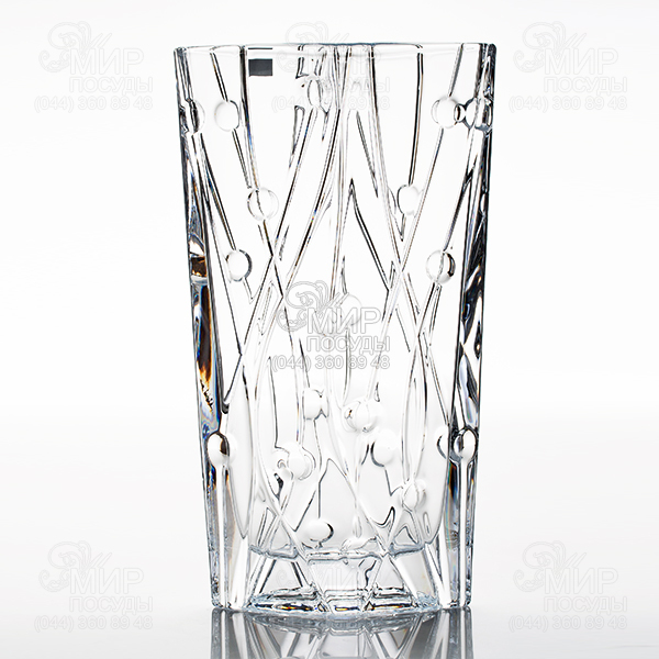 Висока ваза призначена для святкових букетів, підкреслює їхню красу та пишність. Богемське кришталеве скло - це всесвітньо відомий продукт високої якості, виготовлений у Чехії. Широкий асортимент продукції включає посуд щоденного використання, а також ексклюзивні предмети, виготовлені вручну. Відмінною рисою богемського кришталю є відсутність свинцю, що забезпечує безпеку Вашого здоров'я. Замість свинцю використовується оксид титану, який надає міцності посуду та стійкості до стирання. Серія Labirinth відрізняється простотою та вишуканістю. Прямі лінії форм доповнені мінімально різьбленням у вигляді хвилястих горизонтальних ліній, що перемежуються з краплями повітря. Даний дизайн робить аксесуари більш прозорими та невагомими.