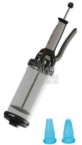 Предлагаемая модель сочетает в себе непревзойденное качество и стильный современный дизайн. Корпус шприца выполнен из качественного пищевого пластика, он в меру прозрачен, что дает возможность контролировать количество выдавливаемого крема. Объем сменного контейнера для шприца составляет 0.75 л. Модель оснащена двумя насадками различного диаметра с гладкой и зубчатой поверхностью.