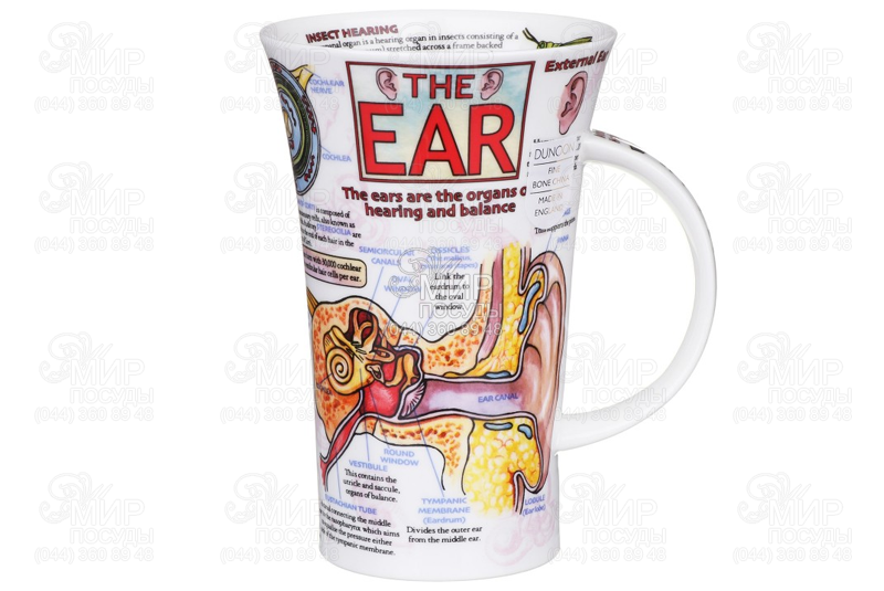 Кухоль Ear від англійського виробника Dunoon виготовлений з кісткового фарфору. Це тонкий, легкий і міцний матеріал, теплий і гладкий на дотик, напівпрозорий на світі, що має особливий глянсово-шовковистий блиск. Місткість має досить зручну форму з ергономічною ручкою. Декорована пізнавальними малюнками з короткими описами.