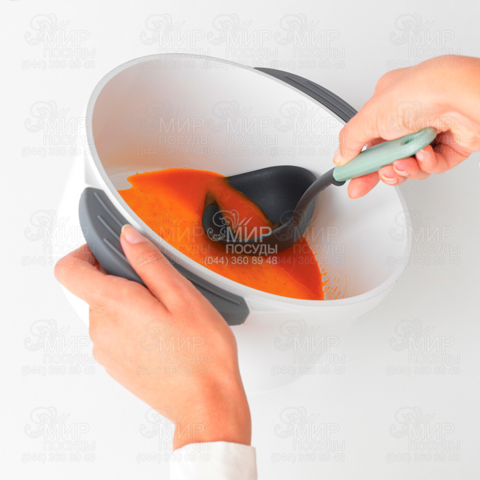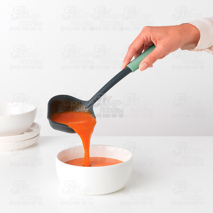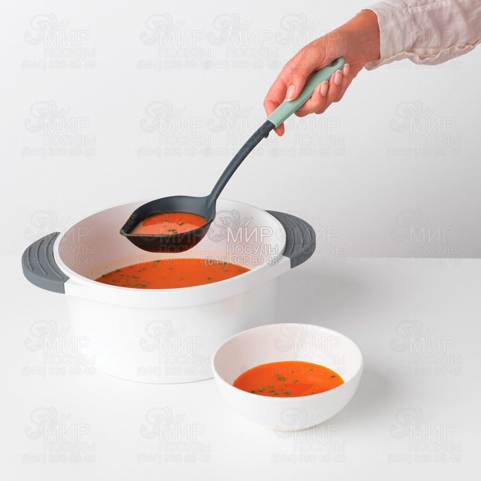 Половник+скребок від бельгійського виробника Brabantia виготовлений із високоякісного нейлону. Ця кухонна приналежність призначена для зачерпування супу та соусу до останньої краплі. Має ідеальну форму, що дозволяє зібрати все з дна і стінок каструлі. Згладжені форми не дряпають посуд із антипригарним покриттям.