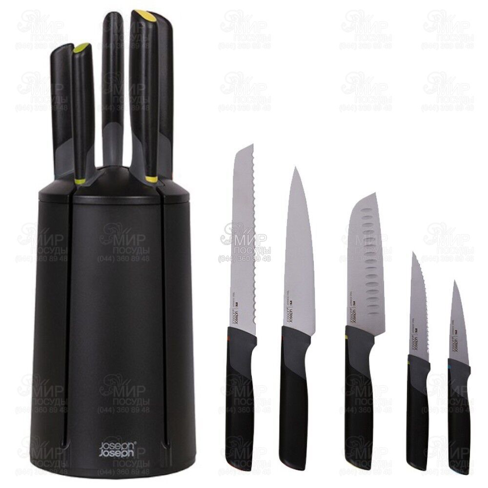 Набір ножів від англійського виробника Joseph Joseph створений для сучасної та функціональної кухні, де все знаходиться під рукою. Включає п'ять ножів різної класифікації. Леза виготовлені з нержавіючої сталі та легко чистяться. Блок, що обертається, має нековзні бази в ножових прорізах для безпечного зберігання.