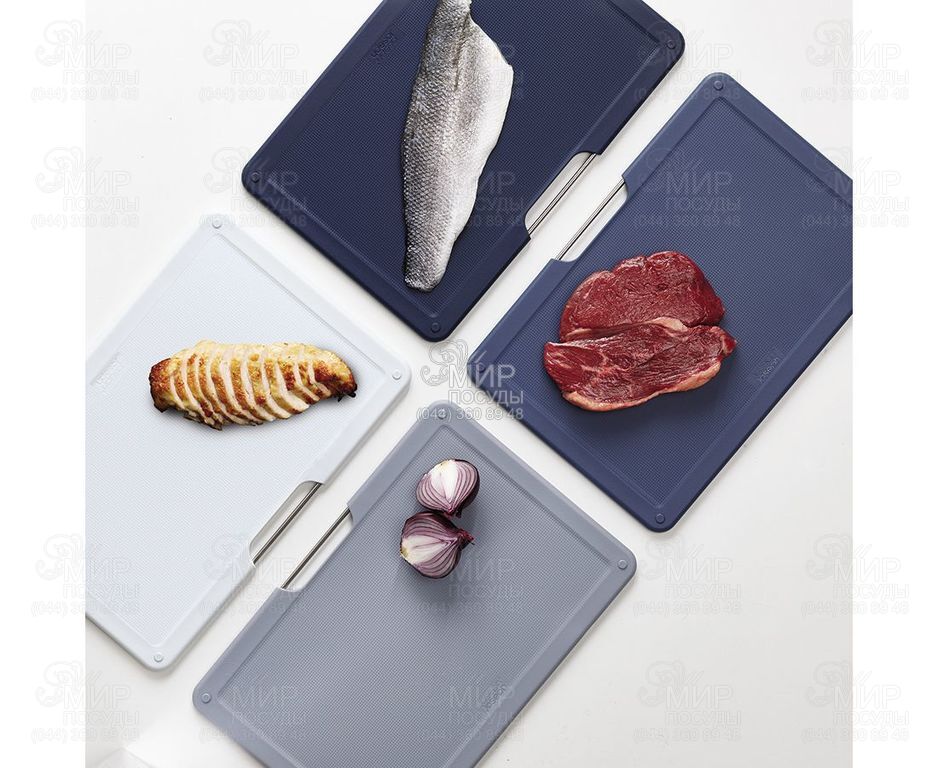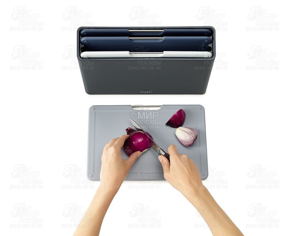 Набір обробних дощок Folio від англійського виробника Joseph Joseph чудово виглядає на домашній та професійній кухні. У комплект входить 4 кольорові аксесуари із закругленими кутами та ковзними ніжками. Невеликі краї по контуру утримують сік і крихти продуктів, що нарізаються. При створенні виробів майстри використовують високоякісний пластик, який не затупляє ножі та при різанні не залишає мікроскопічних частинок на їжі. На текстурованій поверхні дощок не помітні подряпини. Просте і водночас ефективне кольорове кодування дозволяє легко розподіляти дошки для різних типів продуктів, зберігаючи максимальну гігієну в процесі нарізування та виключаючи взаємне забруднення продуктів. Ергономічна ручка у вигляді прутика з нержавіючої сталі дозволяє легко брати аксесуар під час готування. Пластиковий кейс займає мало місця і вписується в будь-який інтер'єр кухні. Підставка утримує аксесуари на відстані, дозволяючи повітря рівномірно циркулювати між ними. Підставку слід протирати вологою тканиною.