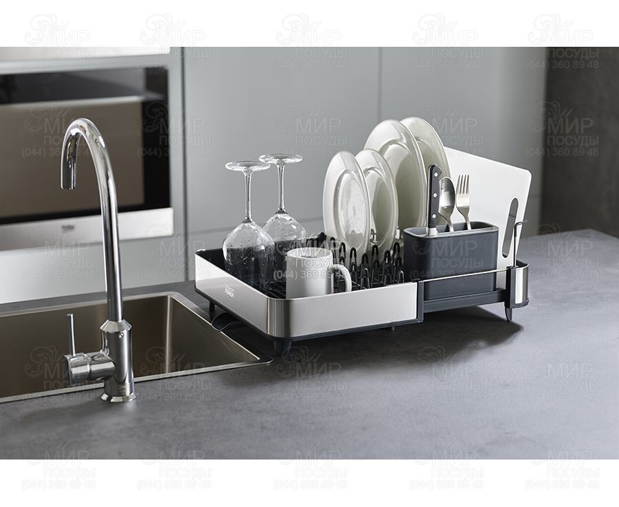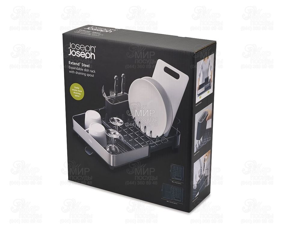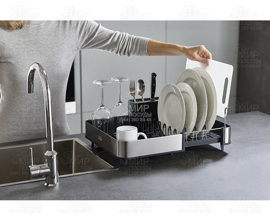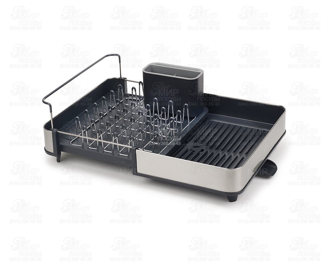 Розсувна сушарка для посуду Extend від англійського виробника Joseph Joseph гармонійно впишеться в інтер'єр будь-якої кухні. Вона легко розсувається під велику кількість посуду, при необхідності вона може змінювати розмір майже вдвічі. Особливість сушарки Extend Steel - стильне оздоблення з нержавіючої сталі. Металеві стійки з м'якими зубцями дбайливо тримають тарілки, захищаючи їх від подряпин. Сталеві грати знімаються для зручного очищення. Вбудована рейка підтримує великі предмети, такі як дошки або кришки. Знімний контейнер для столових приладів доповнений слотами ножів. , ,Сушарка забезпечена регульованим зливним каналом, який спрямовує надлишок води прямо в раковину. Нековзкі ніжки роблять аксесуар більш стійким та надійним.