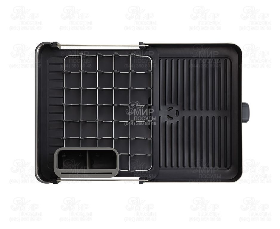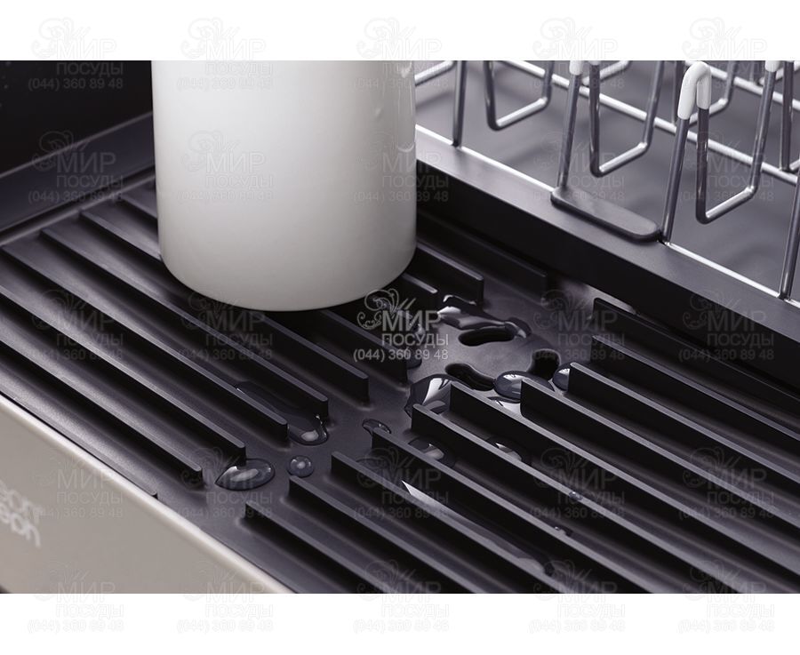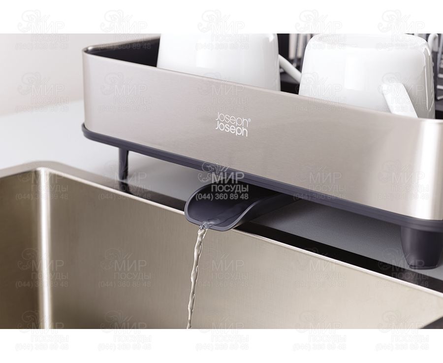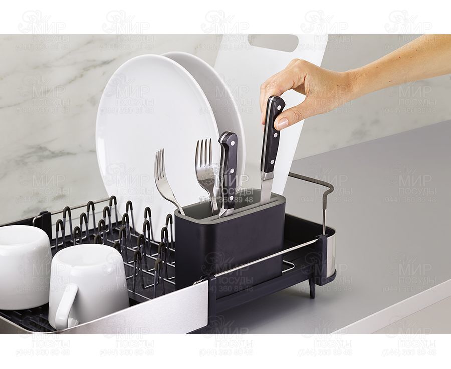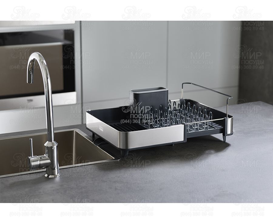 Розсувна сушарка для посуду Extend від англійського виробника Joseph Joseph гармонійно впишеться в інтер'єр будь-якої кухні. Вона легко розсувається під велику кількість посуду, при необхідності вона може змінювати розмір майже вдвічі. Особливість сушарки Extend Steel - стильне оздоблення з нержавіючої сталі. Металеві стійки з м'якими зубцями дбайливо тримають тарілки, захищаючи їх від подряпин. Сталеві грати знімаються для зручного очищення. Вбудована рейка підтримує великі предмети, такі як дошки або кришки. Знімний контейнер для столових приладів доповнений слотами ножів. , ,Сушарка забезпечена регульованим зливним каналом, який спрямовує надлишок води прямо в раковину. Нековзкі ніжки роблять аксесуар більш стійким та надійним.