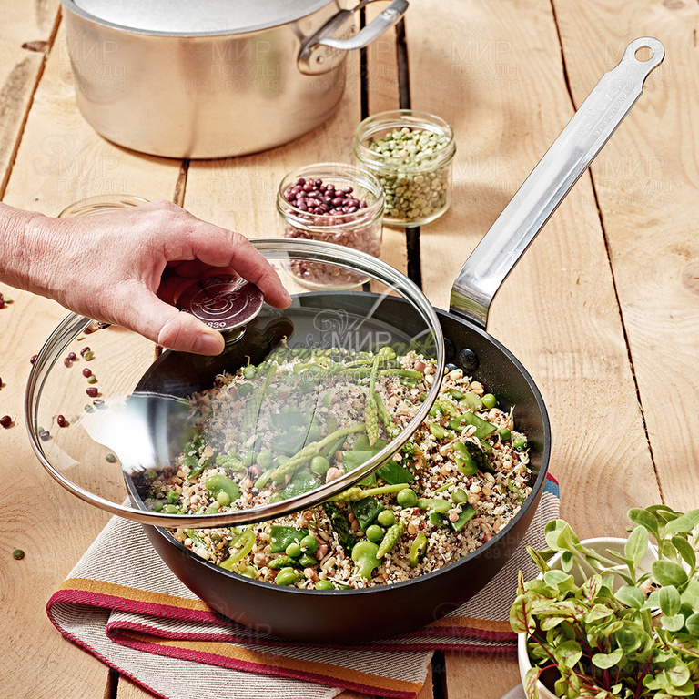 Кришка Milady від французького виробника de Buyer виготовлена з термостійкого скла. Має отвір для виходу пари, обід та ручку з нержавіючої сталі. Скло дає можливість візуально спостерігати, на якій стадії приготування страва не порушуючи температурний баланс у каструлі або сковороді, а металевий обідок оберігає кришку від механічних пошкоджень.