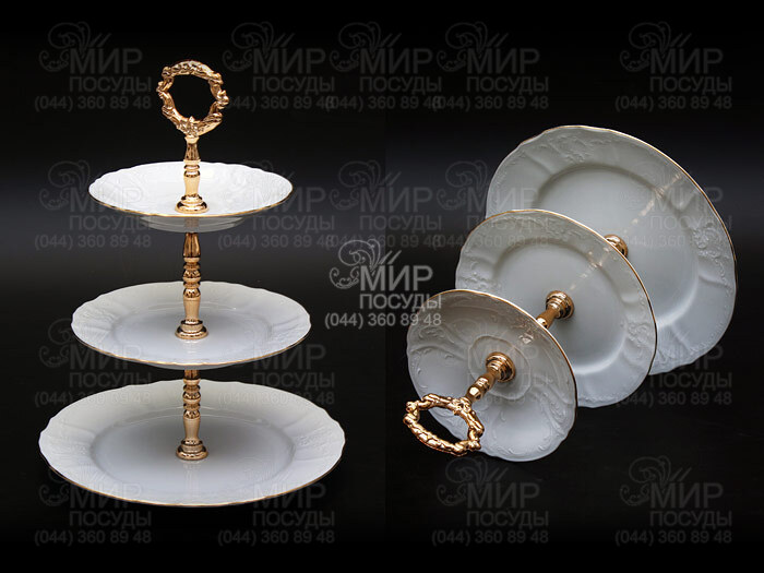 Етажерка 3-ярусна виготовлена з високоякісної чеської порцеляни. Зручна триповерхова гірка (інша назва етажерки) з'єднана посередині міцним стрижнем. Завдяки елегантному вигляду та вишуканому дизайну гірка є прикрасою будь-якого застілля. Практичність її полягає в економії місця на столі та зручності переміщення. Ви з легкістю можете розмістити на різних ярусах етажерки різні страви: бутерброди, фрукти, десерти та ін. Етажерка легко розбирається, що полегшує догляд за нею, а також зберігання.