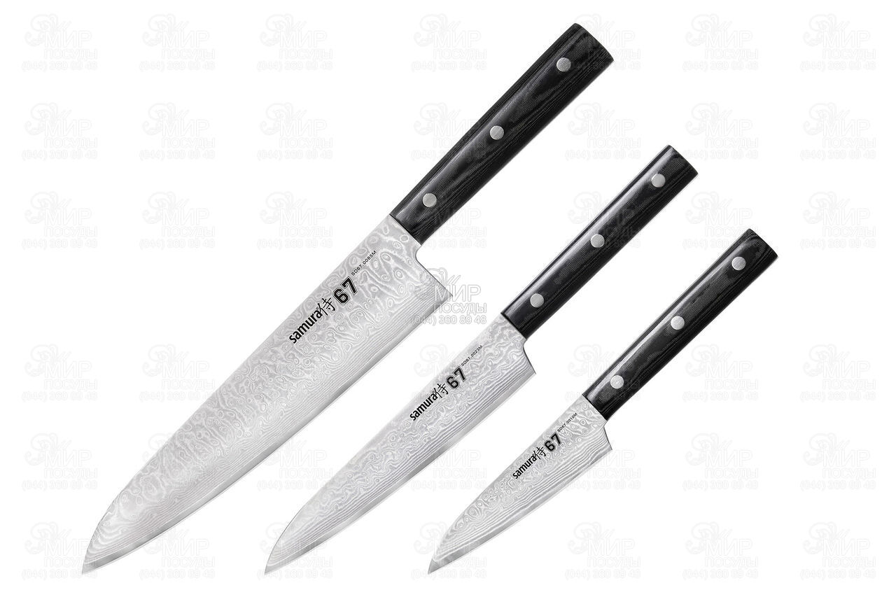 Незамінна "Кухарська трійка" у гарній подарунковій коробці. Центральний шар ножів - високовуглецева сталь VG-10, яка забезпечує ножам бездоганні ріжучі властивості: тривалу гостроту та відмінний, агресивний різ. Візерункові обкладки з SUS430 і SUS431 надають велику пружність, міцність і чудовий зовнішній вигляд. Рукоятки ножів, виконані з мікарти, зручно лежать у руці, не ковзають та стійкі до агресивних середовищ. Ножі із серії 67 Damascus - це чудовий бюджетний варіант елітного дамаська та прикраса на будь-якій кухні.
