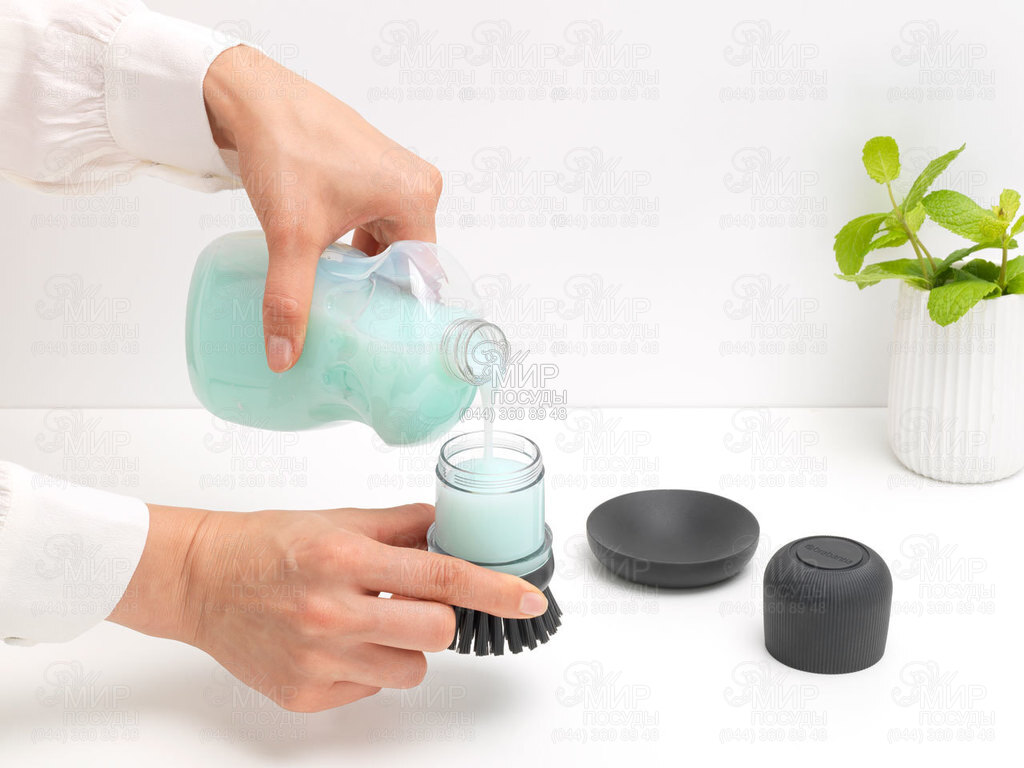 Щітка для посуду з дозатором для миючого засобу Brabantia виготовлена з міцного пластику і має м'які щетинки, що не дряпаються. Завдяки цьому Ви зможете без проблем відчистити їжу, що пригоріла, або жир, не пошкодивши делікатний скляний посуд або антипригарне покриття. Ергономічна нековзна рукоятка забезпечує надійний хват навіть у вологих руках.