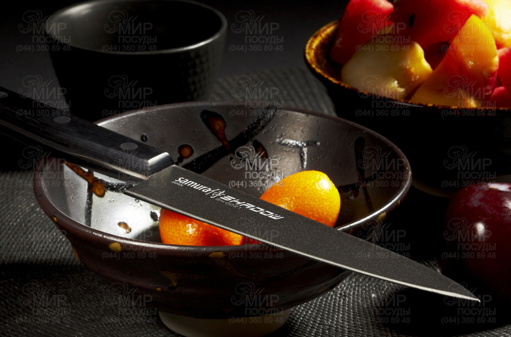 Легкий та багатофункціональний універсальний ніж – найпопулярніший інструмент на домашній та професійній кухні, використовується для різання невеликих овочів та фруктів, сиру, ковбас. Японська нержавіюча сталь AUS-8, з якої виготовлений ніж, має гарну корозійну стійкість, відмінну стійкість ріжучої кромки, легко полірується і шліфується. Покриття Black-coating запобігає прилипанню продуктів при нарізці. Рукоятка ножа, виконана з ABS пластику, зручно лежить у руці, не ковзає, не боїться вологи та перепадів температури, стійка до будь-яких агресивних середовищ. Ідеальний зовнішній вигляд при мінімальному догляді.