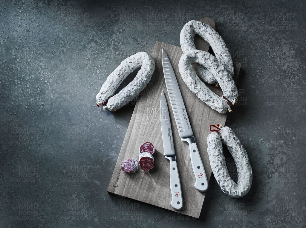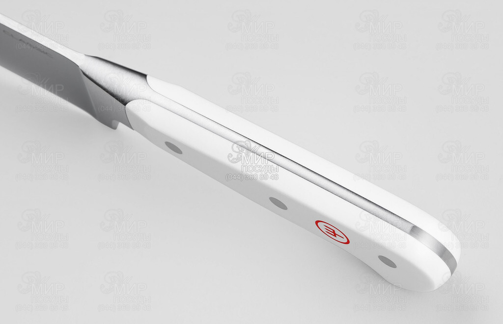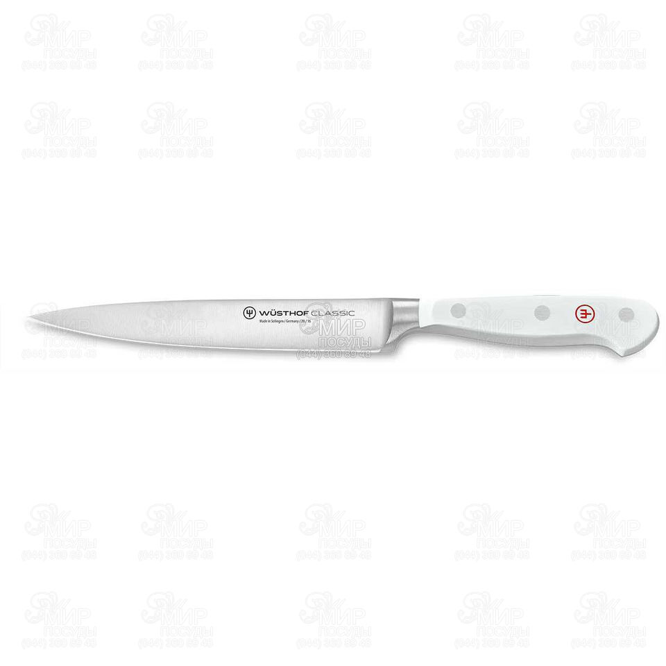 Ніж універсальний від бренду Wuesthof серії Classic White виготовлений із нержавіючої сталі. Коли ви вибираєте для себе ножі Wuesthof, ви завжди можете очікувати на щось особливе! Ножі Wuesthof оснащуються клинками зі спеціальної, стійкої до корозії і хроммолібденванадієвої сталі, що легко заточується. Такий матеріал гарантує чудовий різ. Цей універсальний ніж називають слайсер для шинки. Він заслужив таку назву завдяки надзвичайно тонкому лезу, яке дозволяє нарізати дуже тонкі скибочки твердих інгредієнтів, особливо шинки. Ця якість робить ніж ідеальним для нарізання овочів, фруктів і м'яса.