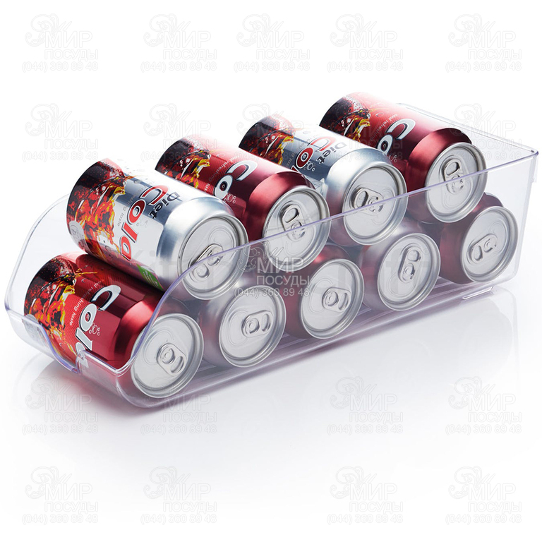 Контейнер для зберігання напоїв у банках містить до 9 банок стандартного розміру. При нахилі ємності на місце банки, яку ви забрали, викочується інша. Пластик, з якого виготовлений контейнер, на 100% безпечний для продуктів харчування, тому його можна використовувати для зберігання м'яса, риби та інших продуктів. Також відмінно підходить для загальної організації холодильника, якщо недостатньо місця для зберігання овочів чи фруктів.