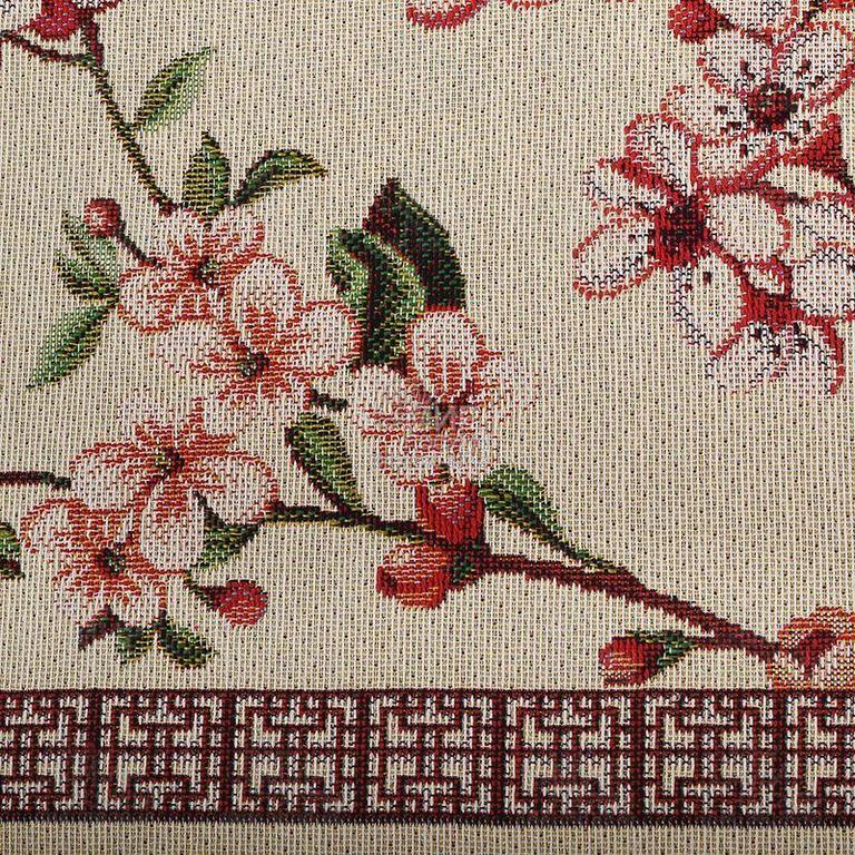 Романтичний та ніжний акцент в інтер'єрі створить гобеленова серветка з візерунком із гілок сакури. Рожеві пелюстки, зелене листя та коричневі стебла виразно виділяються на пісочному тлі, завдяки чіткому фактурному плетиву. Багатобарвна картина виткана з тисяч міцних тонких волокон різного кольору, що дозволило передати всі тонкощі художнього ескізу. Щільний гобеленовий жаккард чудово переносить автоматичне прання, його можна обробляти засобом для виведення плям для кольорових тканин. Навіть через багато років раннер ідеально збереже форму, колір та щільність.