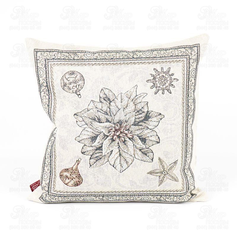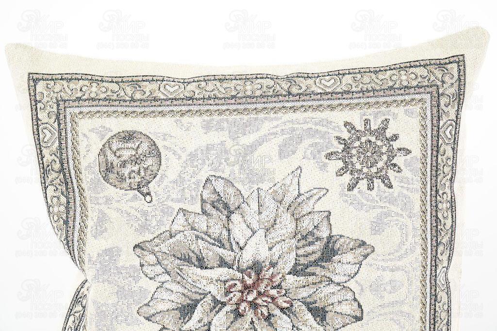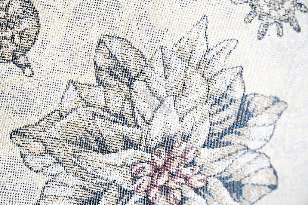 Декоративна наволочка для диванної подушки пошита з високоякісного гобелену іспанського виробництва. Пастельна палітра та сріблясте мерехтіння люрексу передають атмосферу снігової зими, а розкішне суцвіття різдвяної пунсеттії вносить святкову нотку до декору приміщення. Цей виріб створений і для затишного відпочинку, і для оформлення гарного будинку.