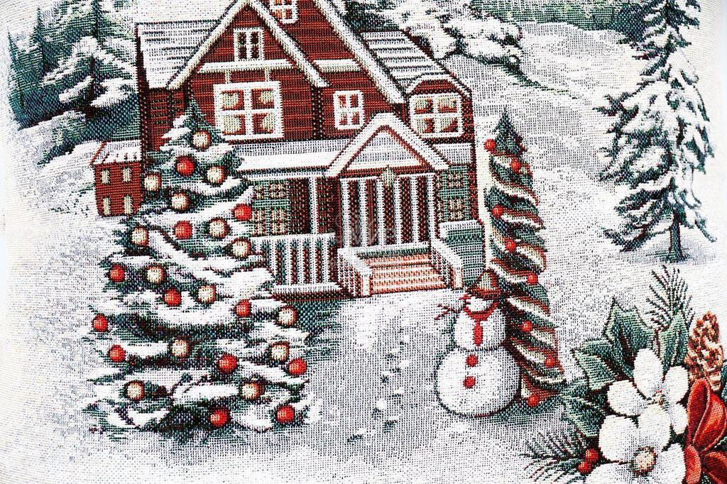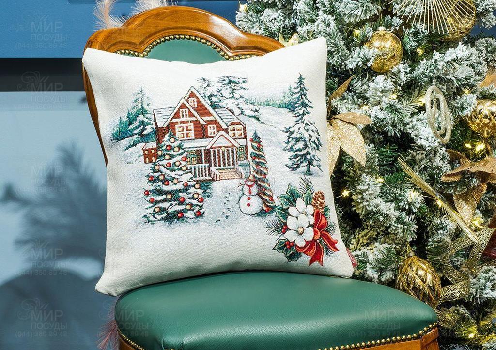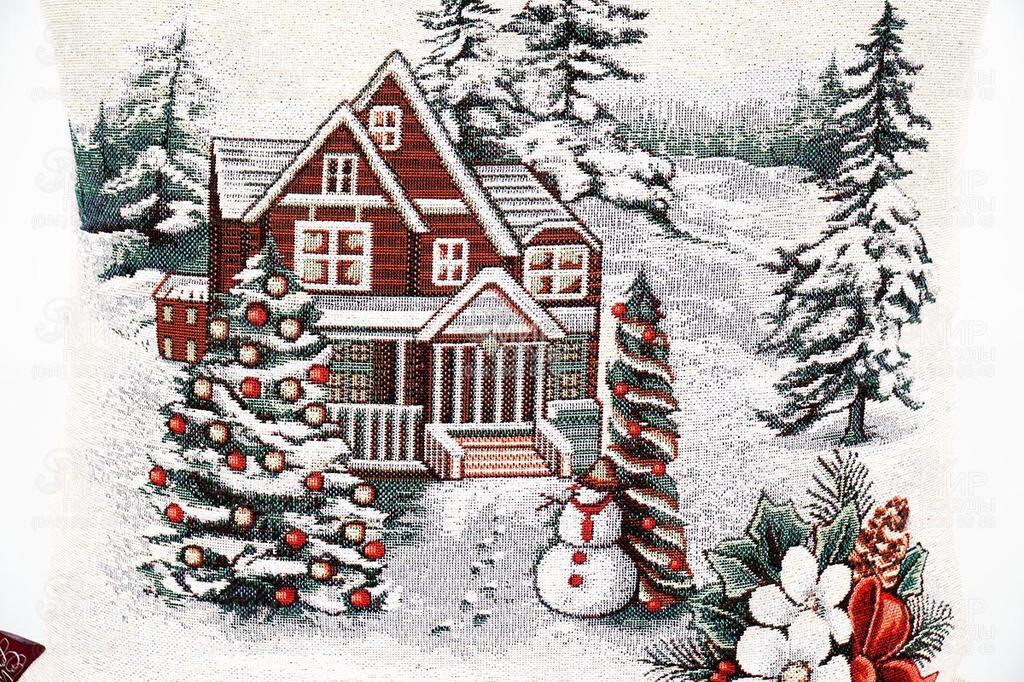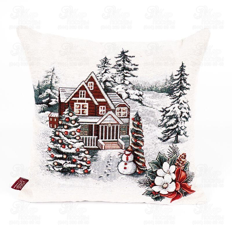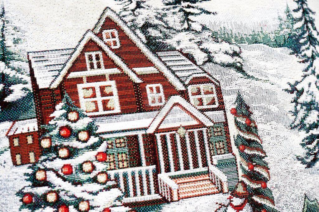 Чудовий новорічний аксесуар створить святковий акцент у будь-якому куточку інтер'єру. На витканому малюнку зображено затишний будиночок, мешканці якого підготувалися до красивої зустрічі Різдва. Яскрава картинка стане розкішною вітальною листівкою, якщо ви купуєте цю наволочку як подарунок.