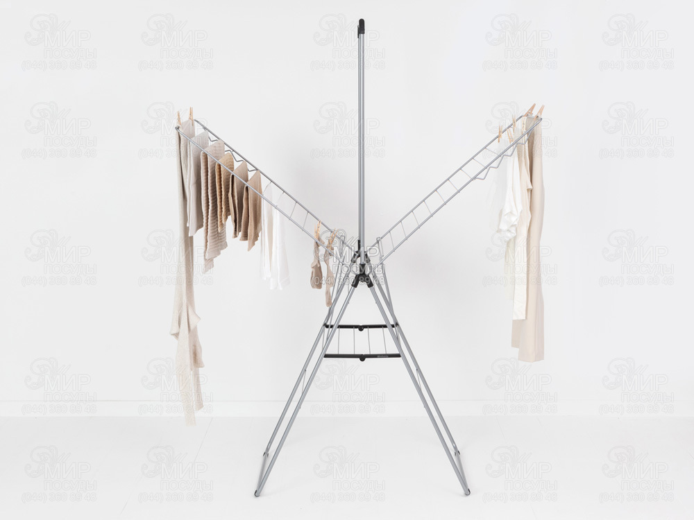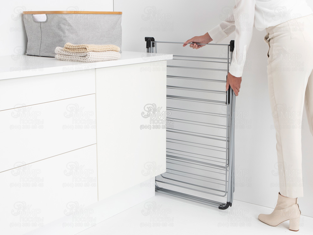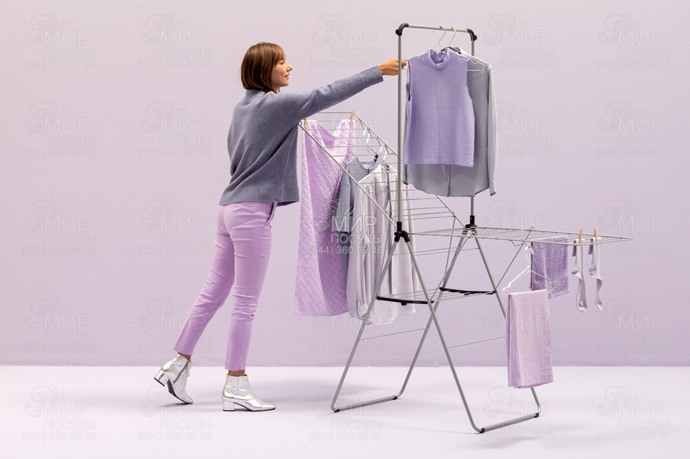 Сушарка для підлоги з поперечиною для 25 метрів навішування. Економимо час та електроенергію, відмовляючись від сушильної машини на користь природного сушіння білизни. Одночасно економимо місце, вибираючи цю компактну сушарку для підлоги. Цілих 25 метрів навішування всього на декількох квадратних метрах плюс поперечина зверху, на якій можна додатково розмістити велику кількість плічок. Закінчивши свою роботу, легко складається до плоского стану та компактно зберігається.