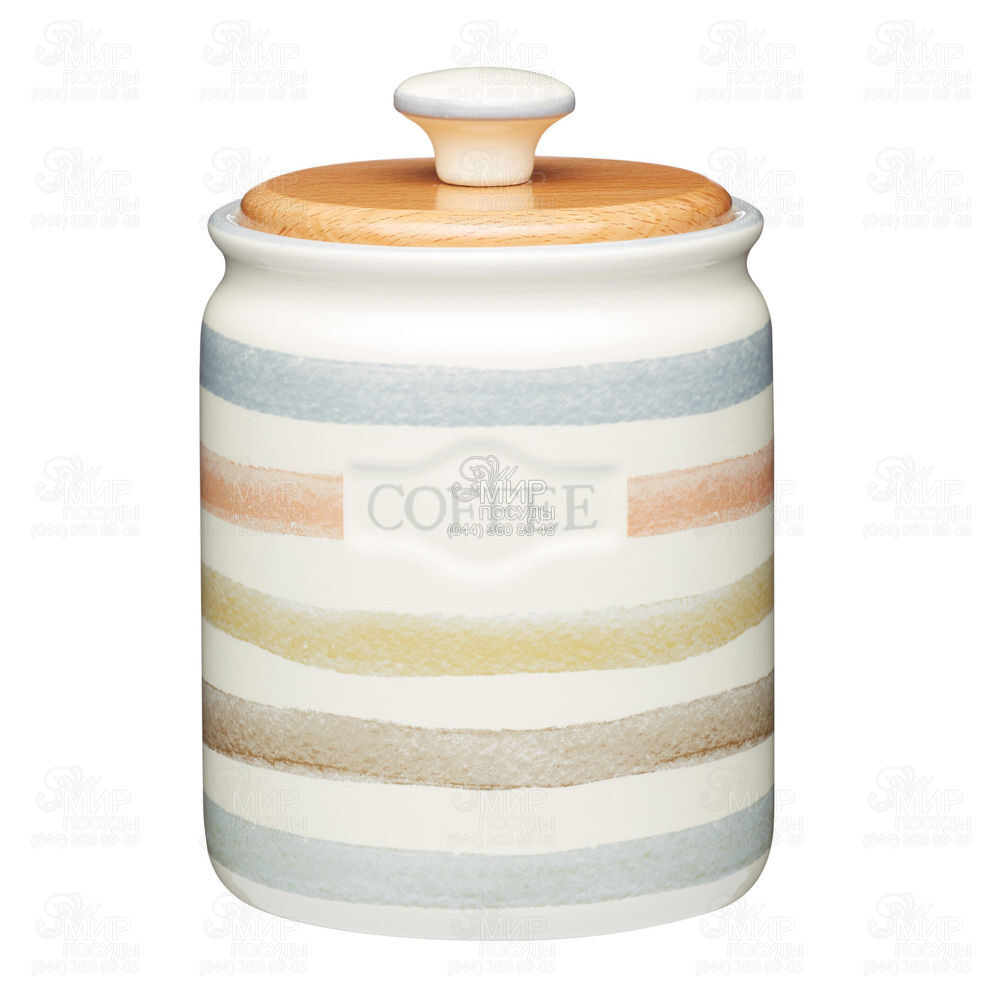 Банк для зберігання Kitchen Craft відноситься до класичної серії кухонного приладдя. Призначена для зберігання кави. Виготовлена з кераміки та оформлена патерном із широких смуг м'яких відтінків на білому тлі. Має дерев'яну кришку із керамічною ручкою.