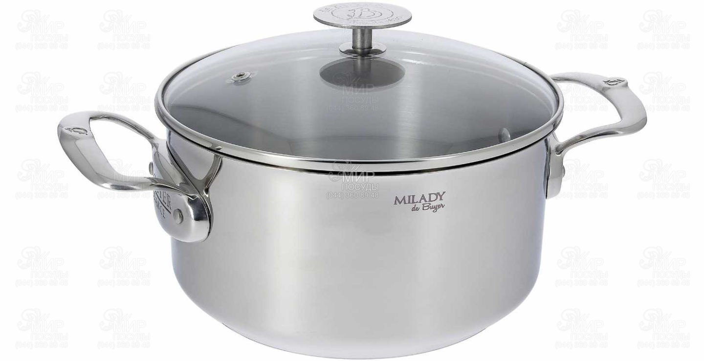 Каструля Milady від французького виробника de Buyer виготовлена з нержавіючої сталі 18/8 із семимиліметровим сендвіч-дном. Має спеціальний обідок для розливу без крапель та оснащена міцними ручками, що кріпляться клепочним методом. Декорована печаткою бренду. Укомплектована практичною скляною кришкою.