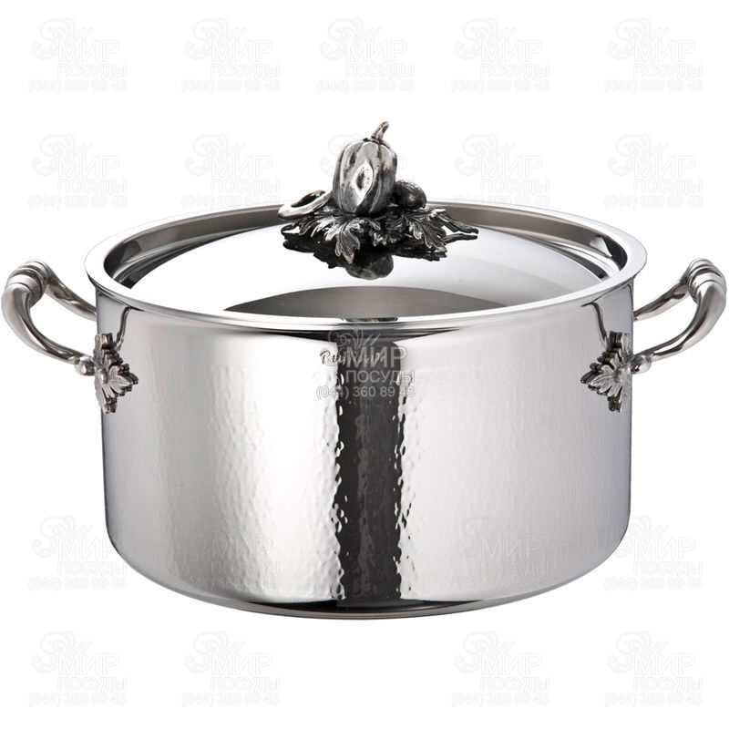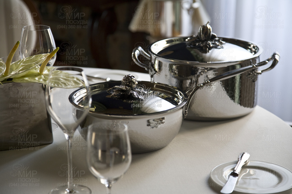 Кухонний посуд Opus Prima зі срібним покриттям. Особлива техніка обробки поверхні карбованими молоточками надає посуду тієї чарівності, яка відрізняє вироблені вручну предмети. Відполірована, як дзеркало, внутрішня частина нержавіючої сталі робить її особливо привабливою. Кришки прикрашені відлитим з латуні овочевим натюрмортом, помідором з горошком і перцем або головкою часнику. Новий посуд не тільки красивий, але й функціональний. Вона підходить для будь-яких видів плит (газових, електричних, керамічних, індукційних) і легко миється в посудомийній машині. Дно та стінки зроблені з кількох шарів нержавіючої сталі (зовнішній 0,4мм та внутрішній 0,4мм) та алюмінію (3шари меджу шарами нержавіючої сталі по 0,7мм кожен) для рівномірного розподілу тепла по поверхні.
