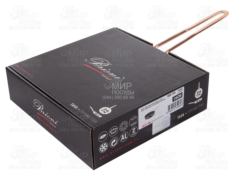 Сковорода від турецького виробника Brioni виготовлена з алюмінію та покрита антипригарною гранітною крихтою за німецькою технологією Greblon, рівень захисту С3. Деталі та ручки - позолочений титановий сплав, що не нагрівається під час використання. Легко миється губкою у теплій воді. Не призначено для миття у посудомийній машині. Підходить для використання на всіх конфорках, крім індукційних.
