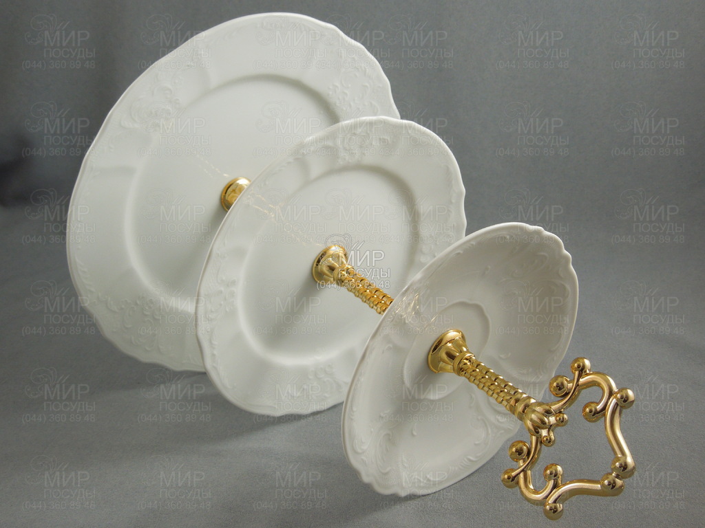 Етажерка 3-ярусна виготовлена з високоякісної чеської порцеляни. Зручна триповерхова гірка (інша назва етажерки) з'єднана посередині міцним стрижнем. Завдяки елегантному вигляду та вишуканому дизайну гірка є прикрасою будь-якого застілля. Практичність її полягає в економії місця на столі та зручності переміщення. Ви з легкістю можете розмістити на різних ярусах етажерки різні страви: бутерброди, фрукти, десерти та ін. Етажерка легко розбирається, що полегшує догляд за нею, а також зберігання.