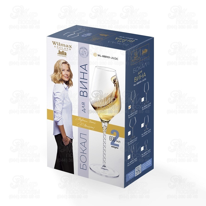 Набір бокалів для вина Wilmax виготовлений з кришталевого скла. Асортимент продукції Wilmax задовольнить всілякі переваги вимогливого ресторатора, а також буде цікавим для споживачів для використання в домашніх умовах. Він включає все необхідне для сервірування Вашого столу, має велику різноманітність форм, що дає можливість підібрати столовий посуд на будь-який смак і для будь-якого інтер'єру. Нова колекція келихів Wilmax, створена спільно з відомою актрисою та телеведучою, автором кулінарних книг – Юлією Висоцькою.